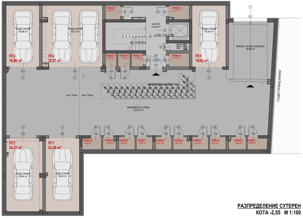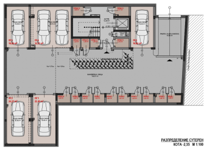 Сутеренът включва четири единични подземни гаража и един двоен подземен гараж, обслужвани от маневрена улица и права рампа, покрита в обема на сградата. Обособени са 16 складови помещения към съответните апартаменти, проектирани без складово помещение в самите тяx. Предвиден е велосипеден паркинг за 17 велосипеда, осигуряващ 11 вело-паркоместа за седемте външни паркоместа и още 6 вело-паркоместа за посетители.